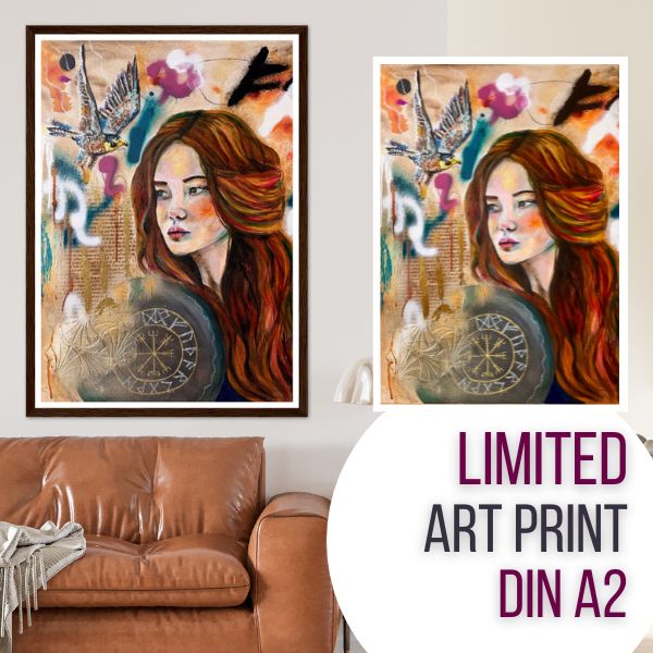 Und so habe ich auf diesem Bild Ausschnitte aus der Lieder-Edda auf altisländisch mit Runen und Graffiti-Stil kombiniert. Lasse dich von Freya inspirieren, deine eigenen inneren Superkräfte zu erwecken! Das Originalwerk sowie die Drucke der offenen Edition (nicht überarbeitet und handsigniert) findest du hier.