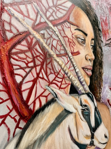 Die Antilope (Oryx) steht für Zielstrebigkeit und seinen Weg zu verfolgen und sie motiviert dich, bei den Dingen dran zu bleiben, die dir wichtig sind. Die Adern, die optisch und physisch aus dem Bild hervortreten, brechen die festen Strukturen auf, in denen wir uns oft gefangen fühlen. Sie stehen auch dafür, deiner Leidenschaft und dem, was wirklich für dich wichtig ist, zu folgen, statt dich vom Lärm der Welt ablenken zu lassen.